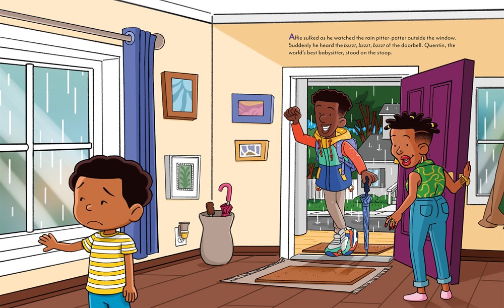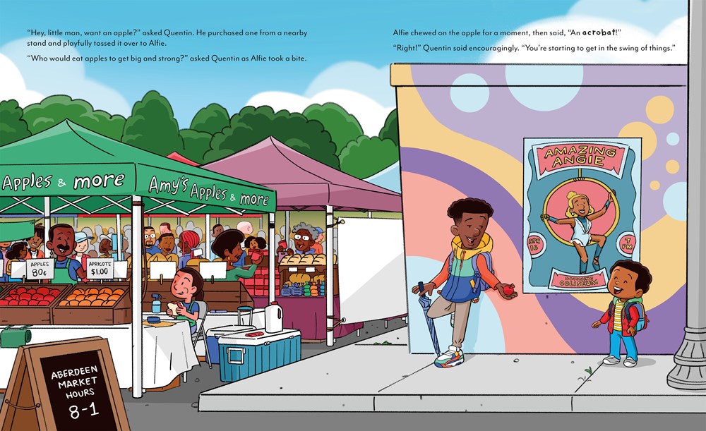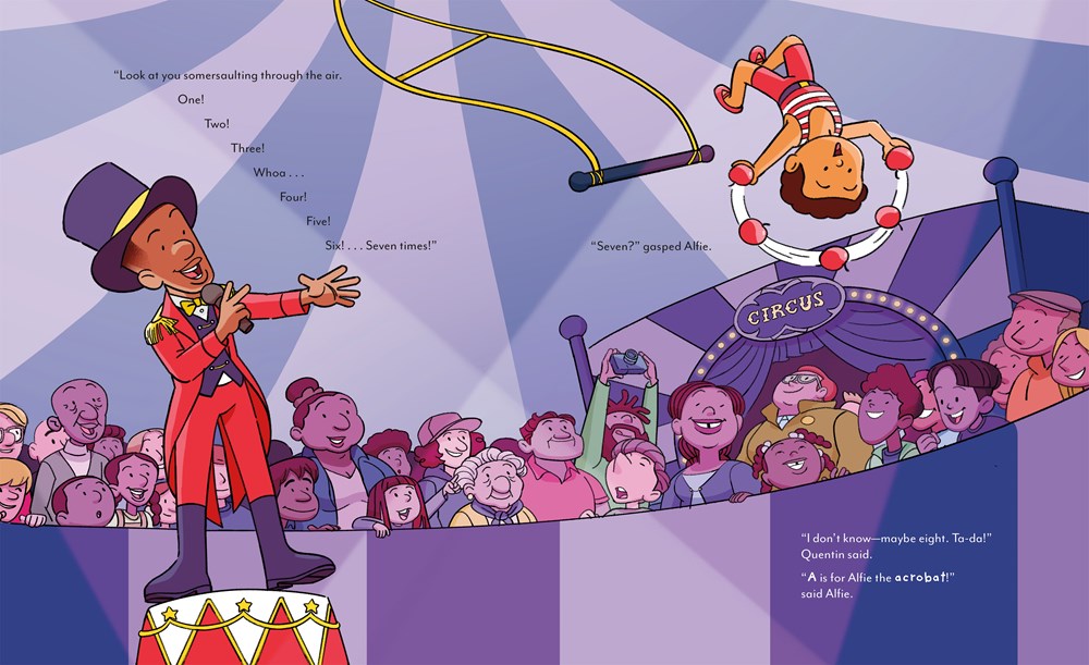 Alfie has been feeling down, and it isn’t just the rain. The kids at school think his name is weird. But when his awesome babysitter Quentin takes Alfie on a walk through their neighborhood, he learns that there are endless possibilities in the letters that make up his name. From “A is for acrobat” to “E is for electrician,” they imagine all the wonderful things Alfie could grow up to be and discover a world of ABCs along the way.