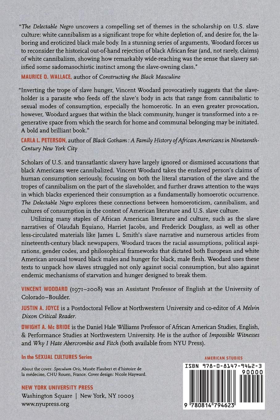 Scholars of US and transatlantic slavery have largely ignored or dismissed accusations that Black Americans were cannibalized. Vincent Woodard takes the enslaved person's claims of human consumption seriously, focusing on both the literal starvation of the slave and the tropes of cannibalism on the part of the slaveholder, and further draws attention to the ways in which Blacks experienced their consumption as a fundamentally homoerotic occurrence. The Delectable Negro explores these connections between homoeroticism, cannibalism, and cultures of consumption in the context of American literature and US slave culture.