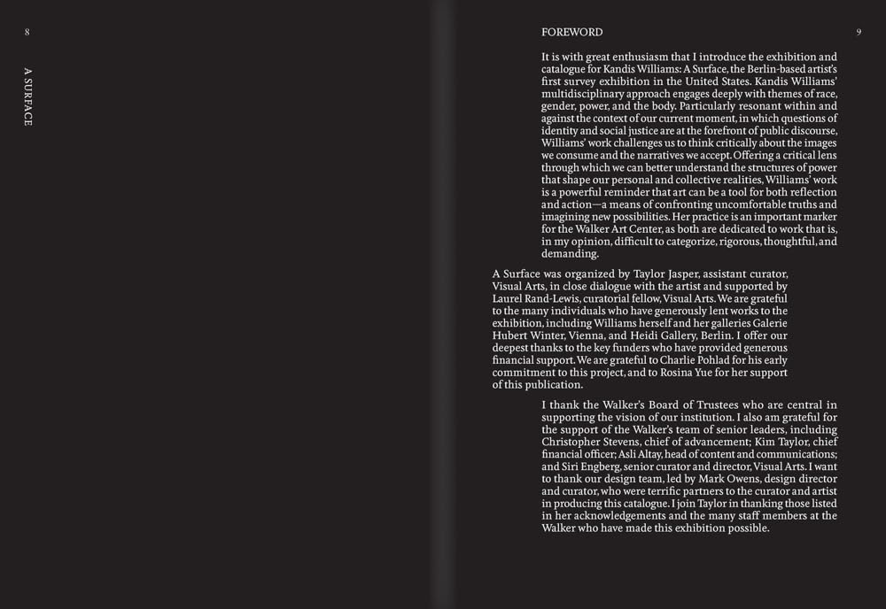 A Surface is Williams' first museum survey, offering visitors an in-depth experience of her vision and practice. The exhibition features both important and lesser-known works from the past decade of her career.