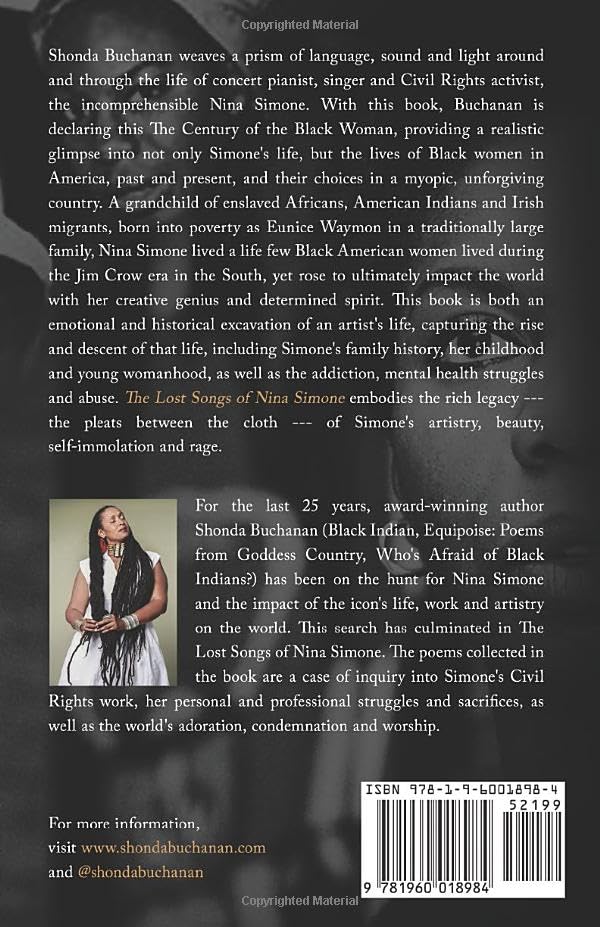 For the last 25 years, award-winning author Shonda Buchanan (Black Indian, Equipoise: Poems from Goddess Country, Who's Afraid of Black Indians?) has been on the hunt for Nina Simone and the impact of the icon's life, work and artistry on the world. This search has culminated in The Lost Songs of Nina Simone. The poems collected in the book are a case of inquiry into Simone's Civil Rights work, her personal and professional struggles and sacrifices, as well as the world's adoration, condemnation and worship. For more information, visit http: //www.shondabuchanan.com and @shondabuchanan.