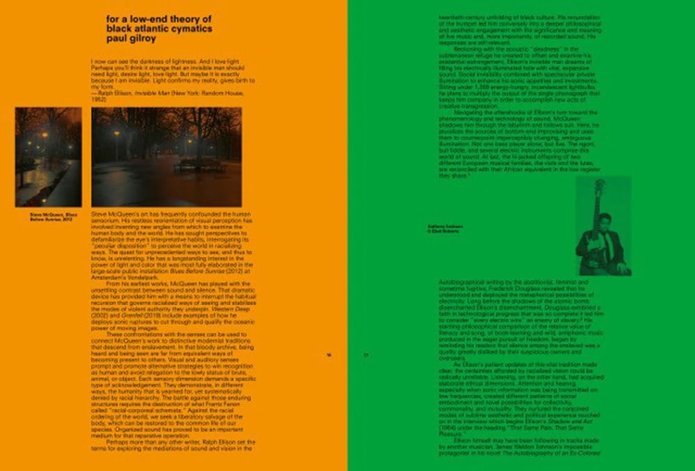 The accompanying publication features an introduction by Dia curator Donna De Salvo, who embeds the work in the context of McQueen's oeuvre to date, along with five essays by leading experts in musicology, cultural studies and Black studies as well as a narrative reflection by an esteemed poet. An extensive series of plates reflects the reverberating character of the color, light and sound installation, with further illustrations documenting the planning and realization process of this site-specific project.