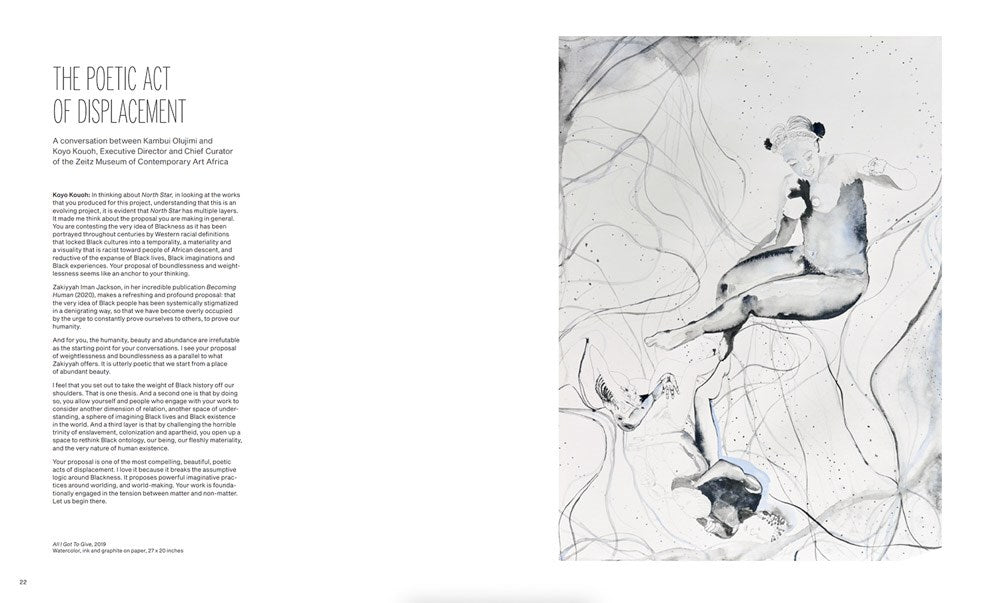 Through an exploration of weightlessness, Olujimi contests the fixed and singular ideas of Blackness as ascribed within persisting colonial imaginations. North Star brings together over five years of Olujimi's artwork, including large-scale watercolor paintings, video installation, ceramic sculpture, a short film and excerpts from a two-day symposium commissioned by Lincoln Center for Performing Arts. Presented in this full color monograph, these works collectively imagine what new relationships we might chart between our bodies, the self and the universe, once deeply entrenched forces are replaced by boundlessness and possibility. This book was made possible through the generous support of the Mellon Foundation.